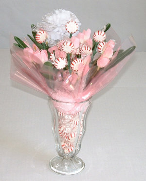 7. Украсьте букет из конфет искусственными тюльпанами и белой гврздикой