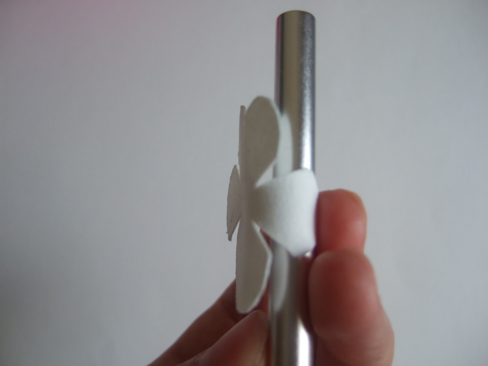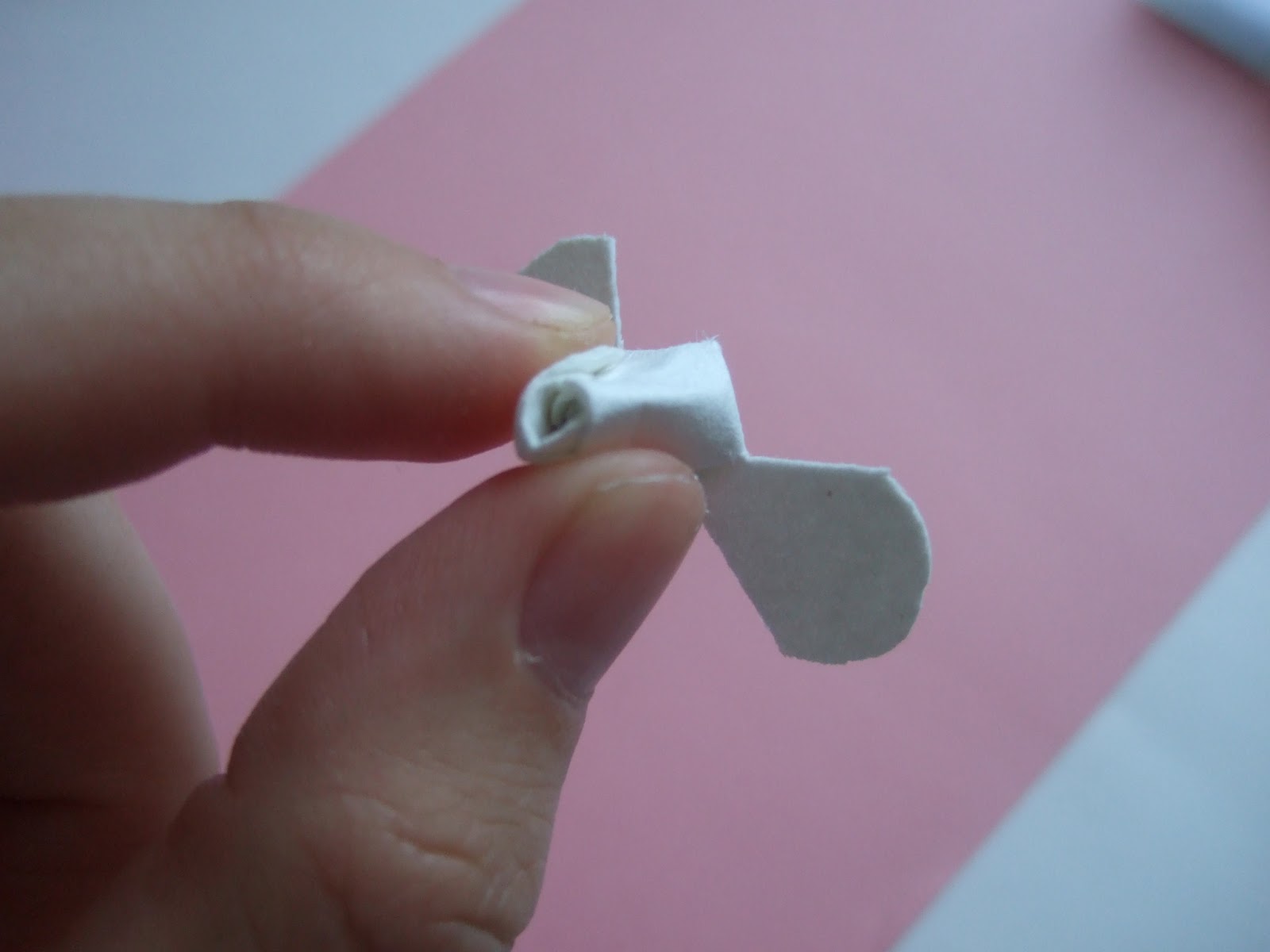 Берем третий лепесток, увлажняем и прикладываем к карандашу (я использую металлическую ручку художественного ножа или крючок), прижимаем пальцами левой руки, а правой рукой сжимаем лепесток с двух сторон (не сильно и аккуратно)