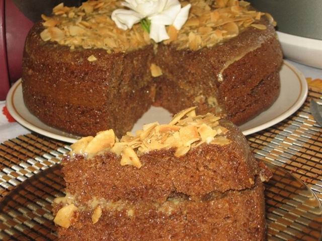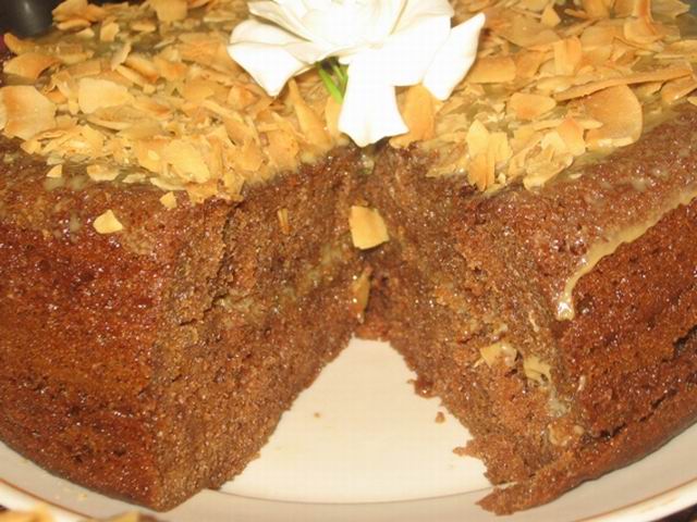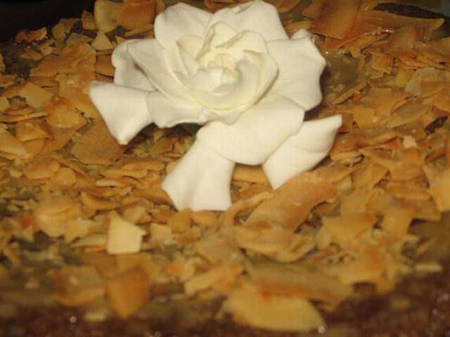 Сверху чем-нибудь украшаем. Я украсила цветком гардении, как раз распустился и миндальной стружкой. Есть его, мы конечно не будем.