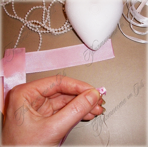 Тем временем, из розовой атласной ленты делаем цветочек для нашего сердечка. Можно использовать и креповую бумагу и любой другой материал.