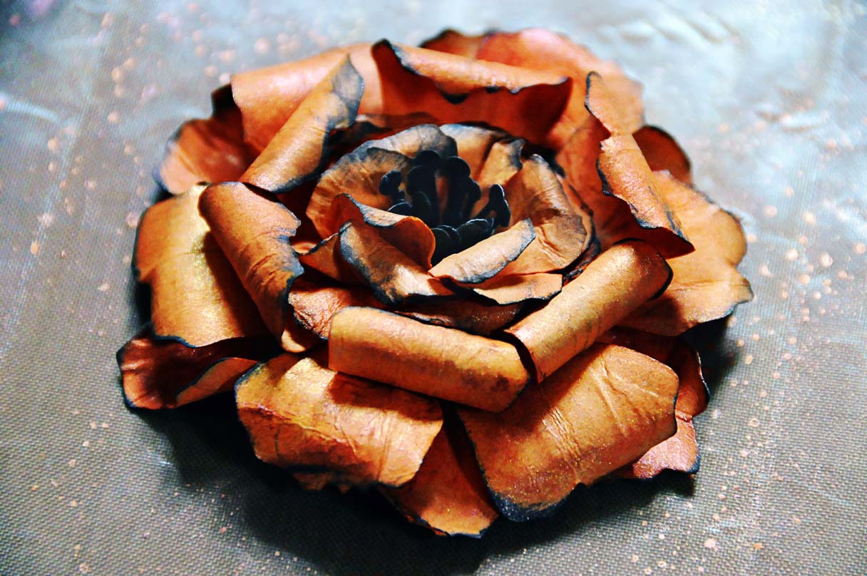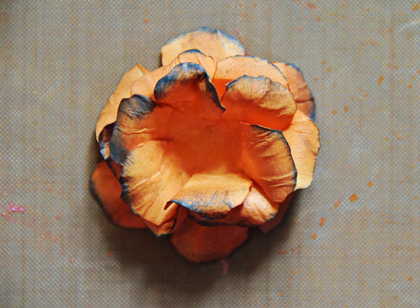 Откройте ваши засушенные цветы и разгладьте их немного. Возьмем один из крупных цветов и закрутим кудри в разных направлениях. Сделайте еще один большой цветок, и завить концы внутрь по направлению к центру цветка, и взять последний крупный цветок и завить концы слегка наружу.
