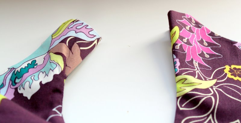 Переходим к поясу. Сложите части, которые вы выкроили ранее пополам лицевыми сторонами друг к другу и срежьте оба конца по диагонали. Прострочите по краю, оставив 8-10 см для выворачивания. Выверните пояс на лицевую сторону. Проутюжьте. Вручную зашейте отверстие, которое использовали для выворачивания.