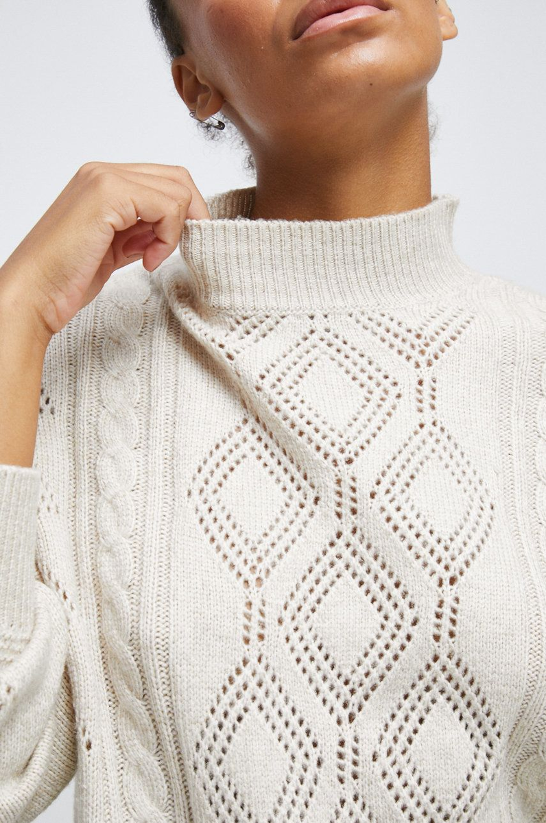 Спереди - это классический свитер с рукавом реглан, благородного бежевого цвета, с узором в виде кос и ромбов: