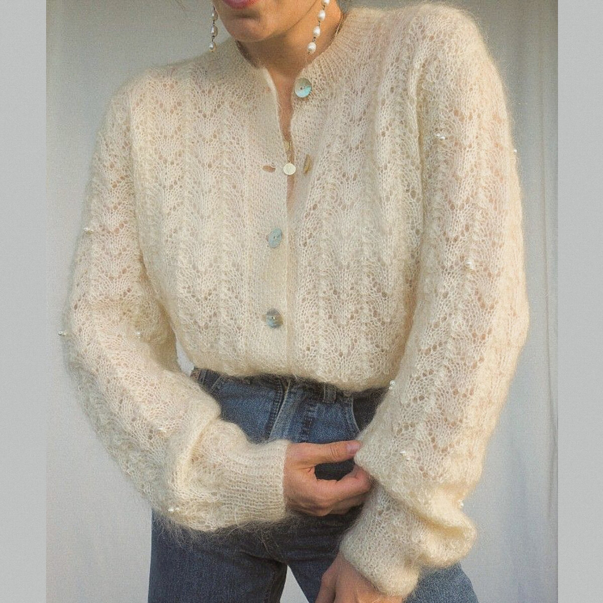 По рукавам кофточка украшена жемчужным бисером, который идеально подходит к цвету полотна.