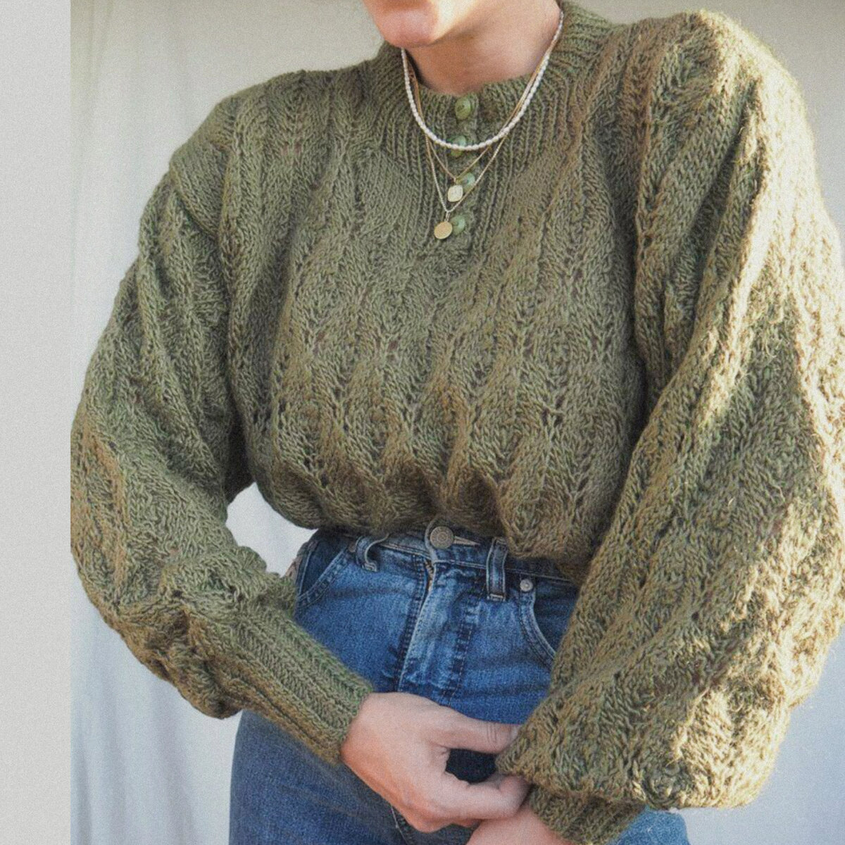 Джемпер с пуговицами у горловины выполнен узором в виде листьев. Узор хоть и ажурный, но совсем не "дырявый", понравится тем, кто не любит активный ажур в тёплых джемперах.