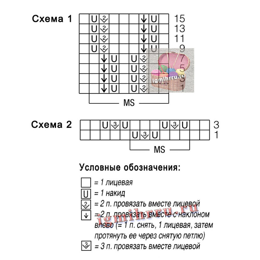 Ажурный узор: число петель кратно 8 + 1 петля. Вязать по схеме 1, на которой даны только лицевые ряды. В изнаночных рядах все петли и накиды провязывать изнаночными. Раппорт постоянно повторять, закончить петлей после раппорта. Постоянно повторять 1–16-й ряды.