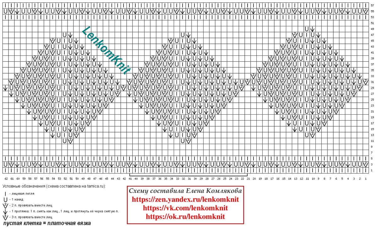 На схеме - узор в виде трех ромбов для правой и левой полочки. Раппорт узора в высоту - 58 рядов. В ширину один ромб - 20 петель. В оригинале правая и левая полочки - по 62 петли плюс две кромочных.