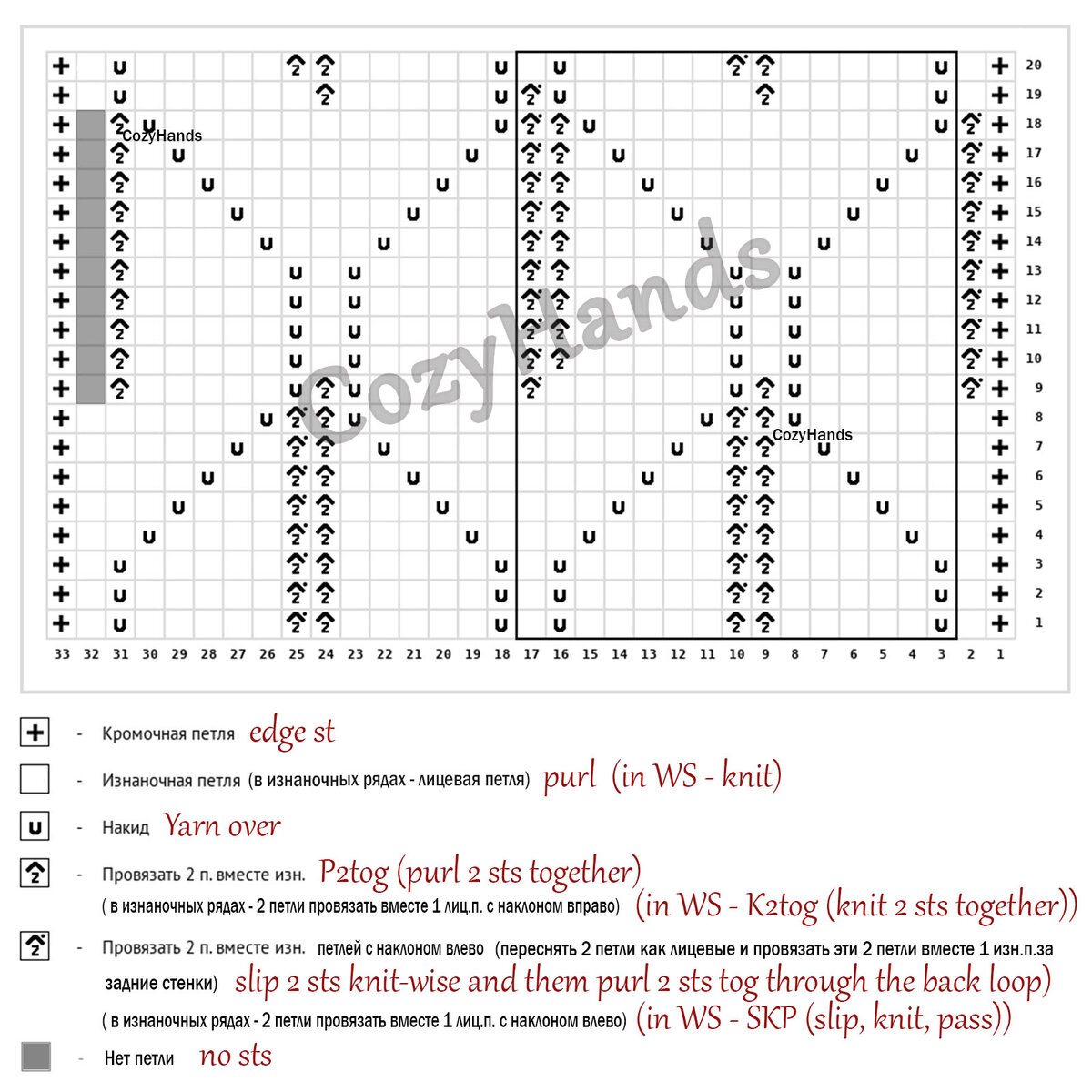 2, 20 ряд (изнаночный): кром.п., * 1 лиц.п., 1 накид, 5 лиц.п., 2 петли провязать вместе 1 лиц.п. с наклоном влево, 2 петли провязать вместе 1 лиц.п. с наклоном вправо, 5 лиц.п., 1 накид,* 1 лиц.п., кром.п.