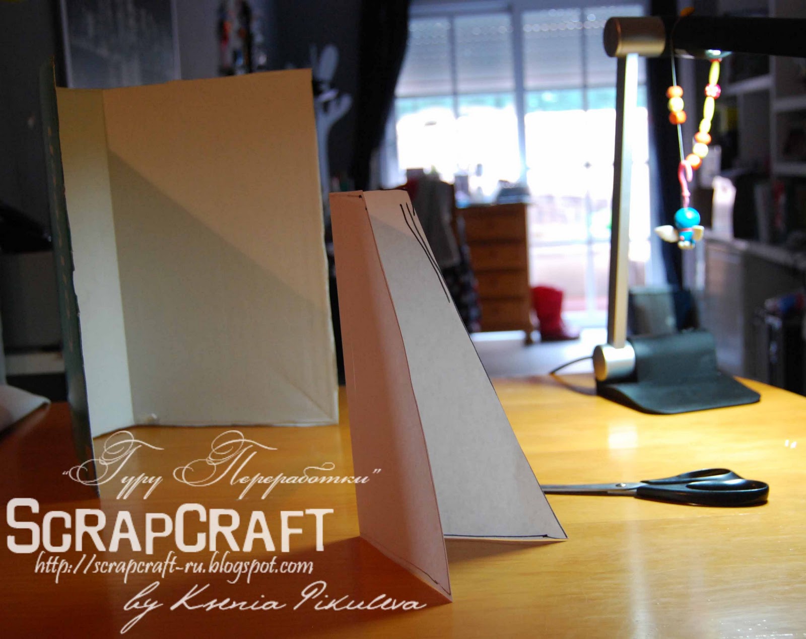 Располагаем коробку вертикально на листе бумаге, "открыв" на ту ширину, с который мы хотим, чтобы открывалась будущая сумка. Обводим получившийся "почти треугольник" маркером