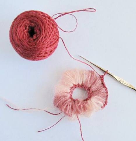 Теперь берем "Ирис" и крючок и начинаем соединять по одному из краев нашу мохеровую "спиральку", захватывая сразу по 7-9 нитей. Картон по ходу работы можно отрывать кусочками и вытаскивать из вязания.