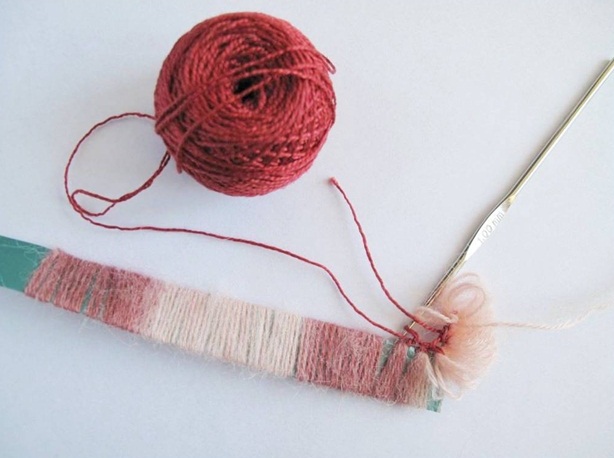 Возьмите полоску картона и завяжите на ней кончик мохеровой нити.