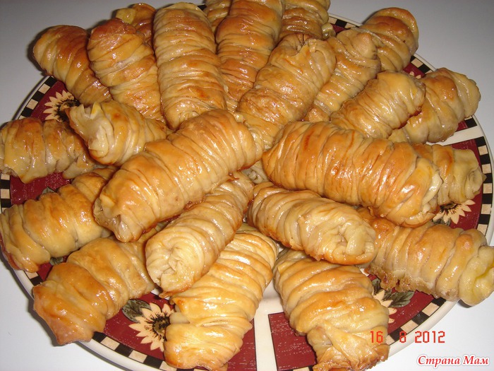 Вот решила вчера сделать турецкую пахлаву, которая понравилась Джалилке. Сделала половину порции и все равно в процессе тысячу раз пожалела, что начала. Уж очень надоело раскатывать тесто. Сначала я по одной раскатывала, а потом уже по 3-4 одновременно. Получилась вот такая пахлава. Это все что получилось.