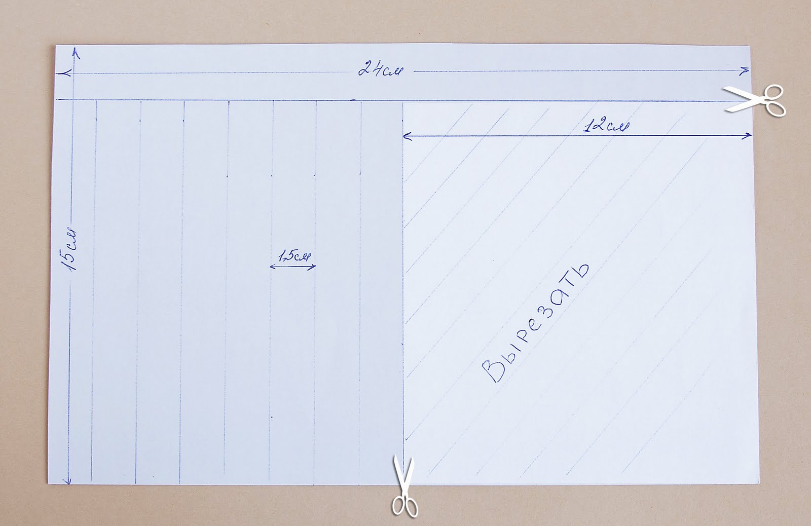 На схеме хорошо видно, какую часть вырезать из заготовки.Тут видно, какая часть вырезана, оставшийся лист разрезаем на полоски, не доходя до верха примерно на 1,5 см.