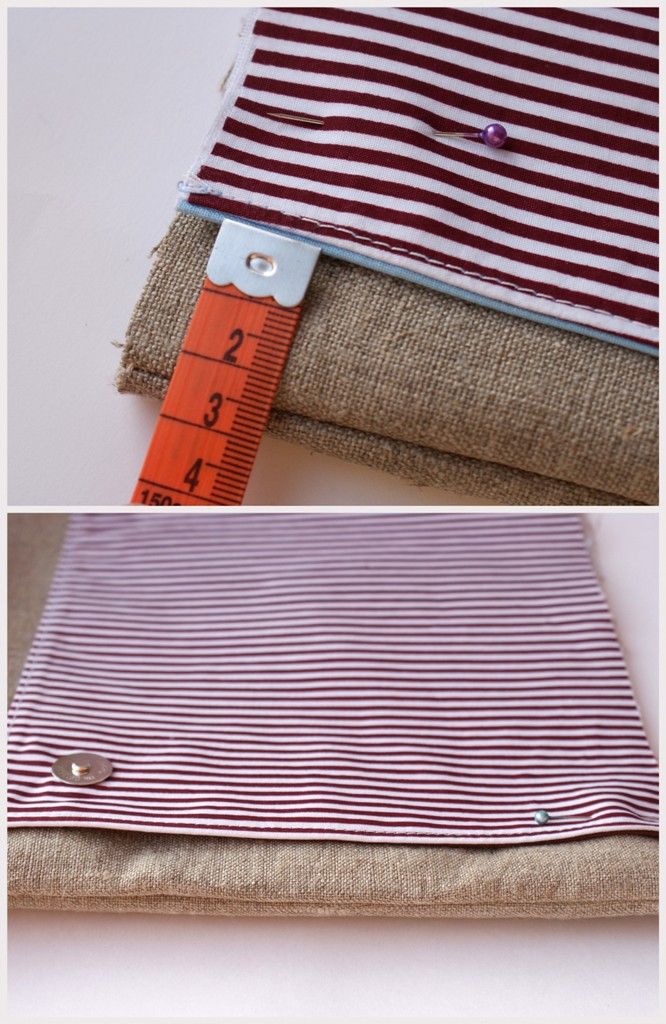 На фото видно, что для основной ткани я выбрала холст, для клапана – американский хлопок в полоску, подкладка обычная бязь.