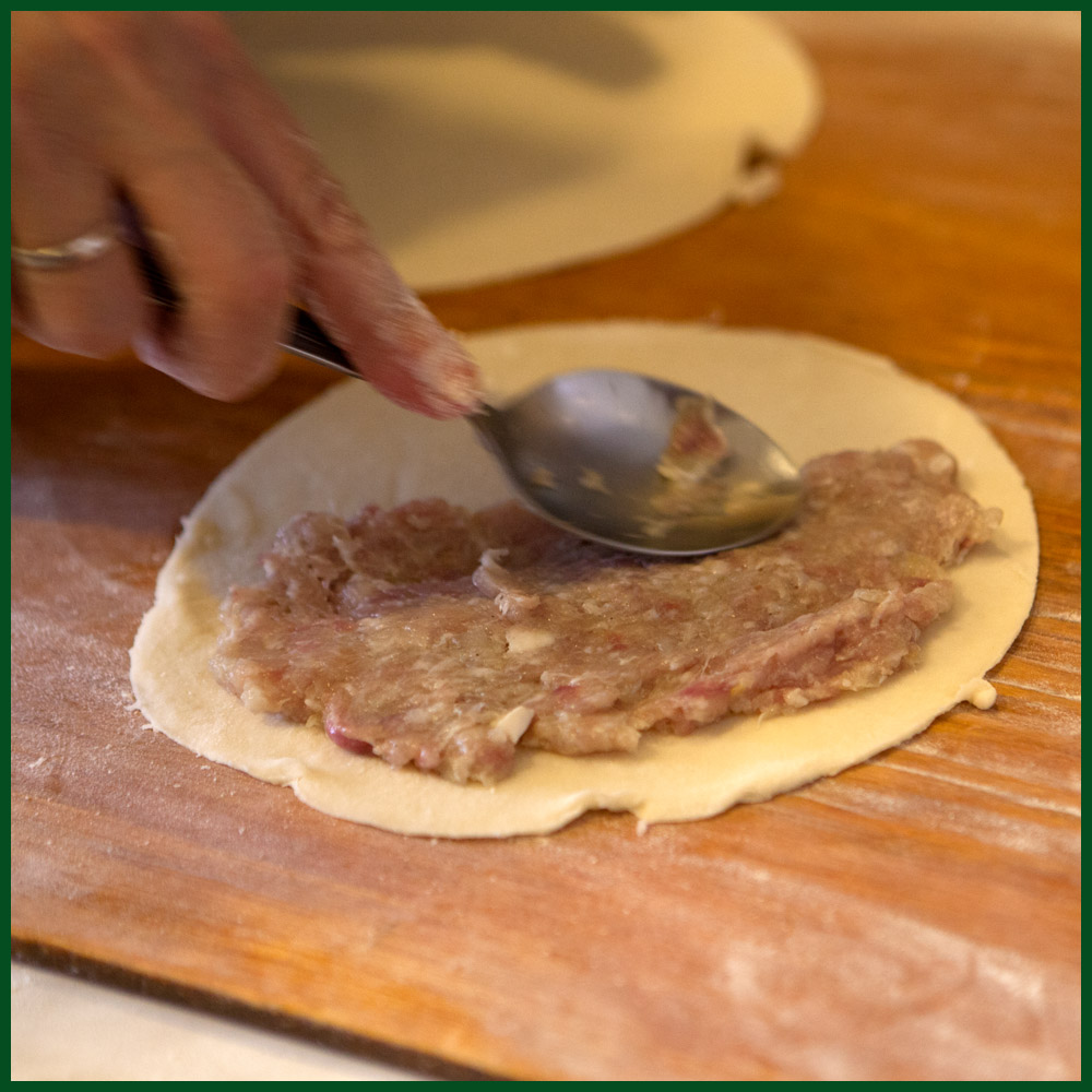 Начинка: фарш на ваш вкус с добавлением лука и воды или кефира (для сочности