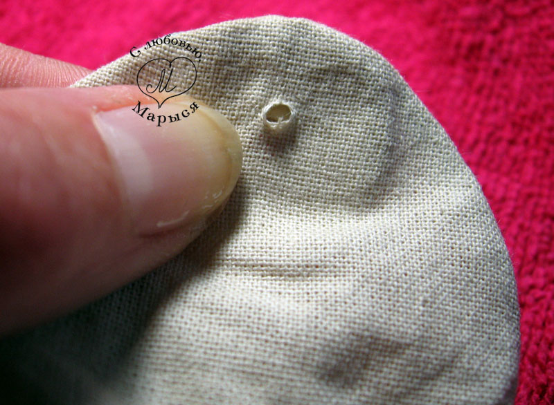 Острыми маникюрными ножницами, просунув их внутрь детали и проведя в отверстия шайбы и диска проделываем отверстие для шплинта. Обращаю ваше внимание, диск должен находится между тканью и защитной шайбой.
