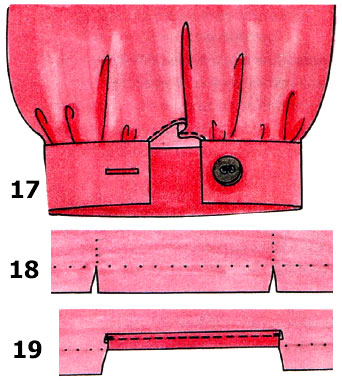 Это самый простой и быстрый способ выполнения шлицы (17). Ее выполняют на коротких рукавах и рукавах длиной 3/4, а также на рукавах с фигурными манжетами.