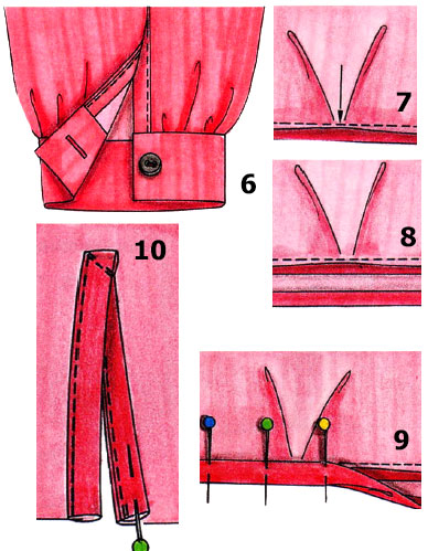 Разрежьте рукав по линии разреза. Края разреза разложите в прямую линию и притачайте к обтачке лицевой стороной к лицевой стороне близко к срезу. При этом у конца разреза, помеченного стрелкой, проложите строчку практически у среза (7). Припуски шва заутюжьте на обтачку. Другой продольный срез обтачки заутюжьте так, чтобы расстояние от сгиба до шва притачивания было в два раза больше ширины готовой обтачки (8). Сложите обтачку вдвое изнаночной стороной вовнутрь и приколите к шву притачивания (9). Пришейте обтачку вручную или притачайте с лицевой стороны рукава близко к шву, прихватывая при этом внутреннюю половину обтачки. У верхнего конца разреза стачайте обтачку наискосок, как маленькую вытачку. У переднего края разреза — это край, расположенный дальше от бокового среза рукава, — отверните обтачку на изнаночную сторону, приколите (10). У заднего края разреза обтачка выступает как припуск под застежку.