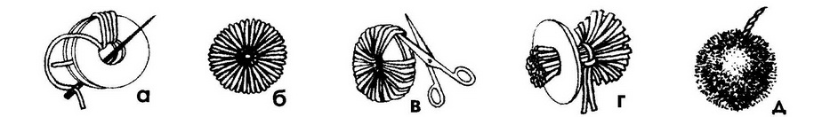 Помпоны делают следующим образом. Из картона вырезают 2 одинаковых кружка диаметром 3-4 см. В центре делают отверстие от 1 до 1,5 см. Кружочки складывают вместе и обвивают нитью с иглой (рис. а) до полного заполнения внутреннего отверстия (рис. б). Все намотанные нити (рис. в) разрезают ножницами по внешней стороне круга. Затем немного раздвигают кружки, пропускают между ними прочную катушечную нить и туго завязывают нити (рис. г). Картонные кружки удаляют, а помпон аккуратно ровняют ножницами (рис. д). Помпон делают однотонным или разноцветным. Концами прочной нити помпон прикрепляют к изделию.