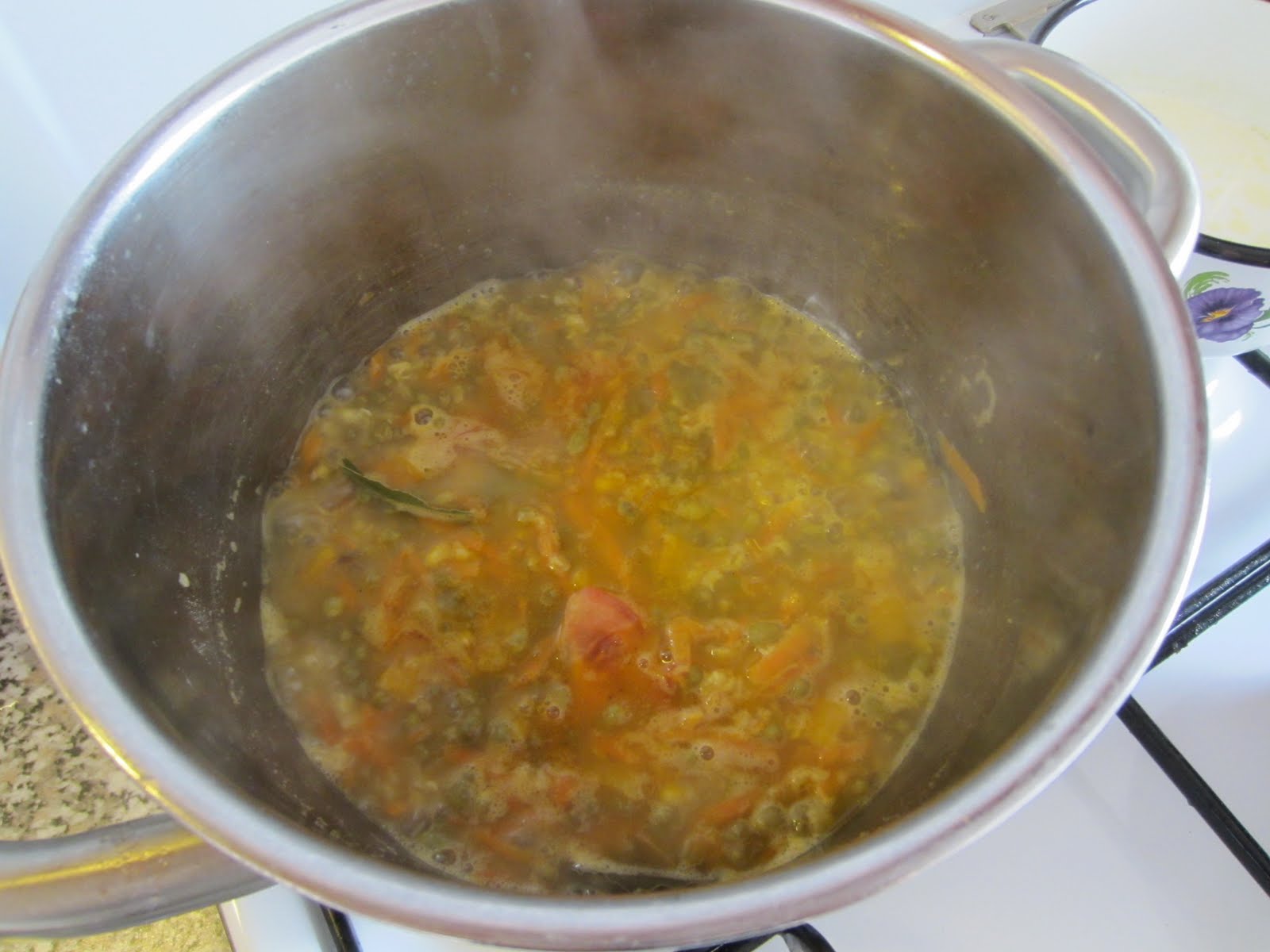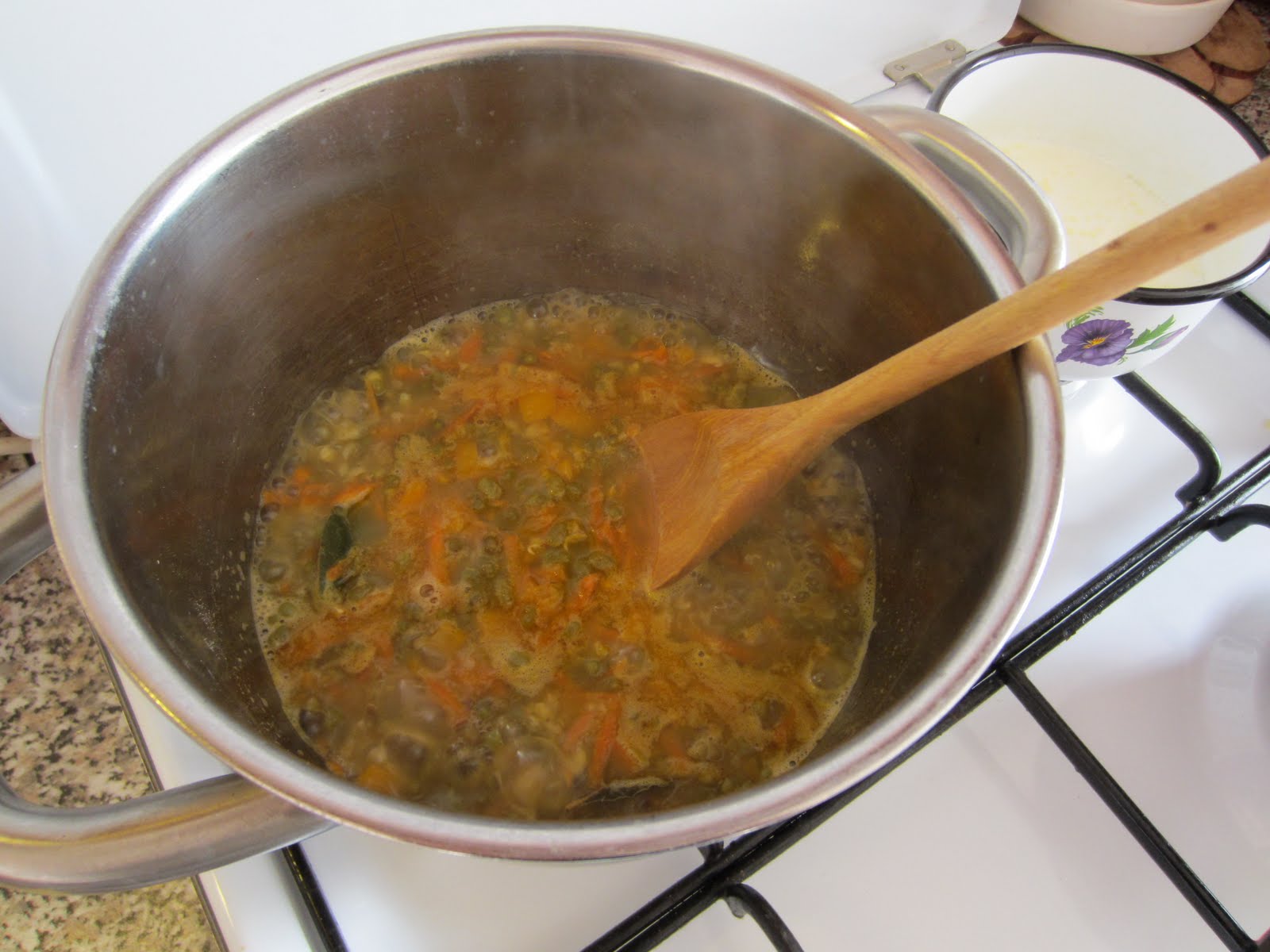 Когда маш поварился минут 30, добавляем овощи в кастрюлю и даем повариться еще минут пять.