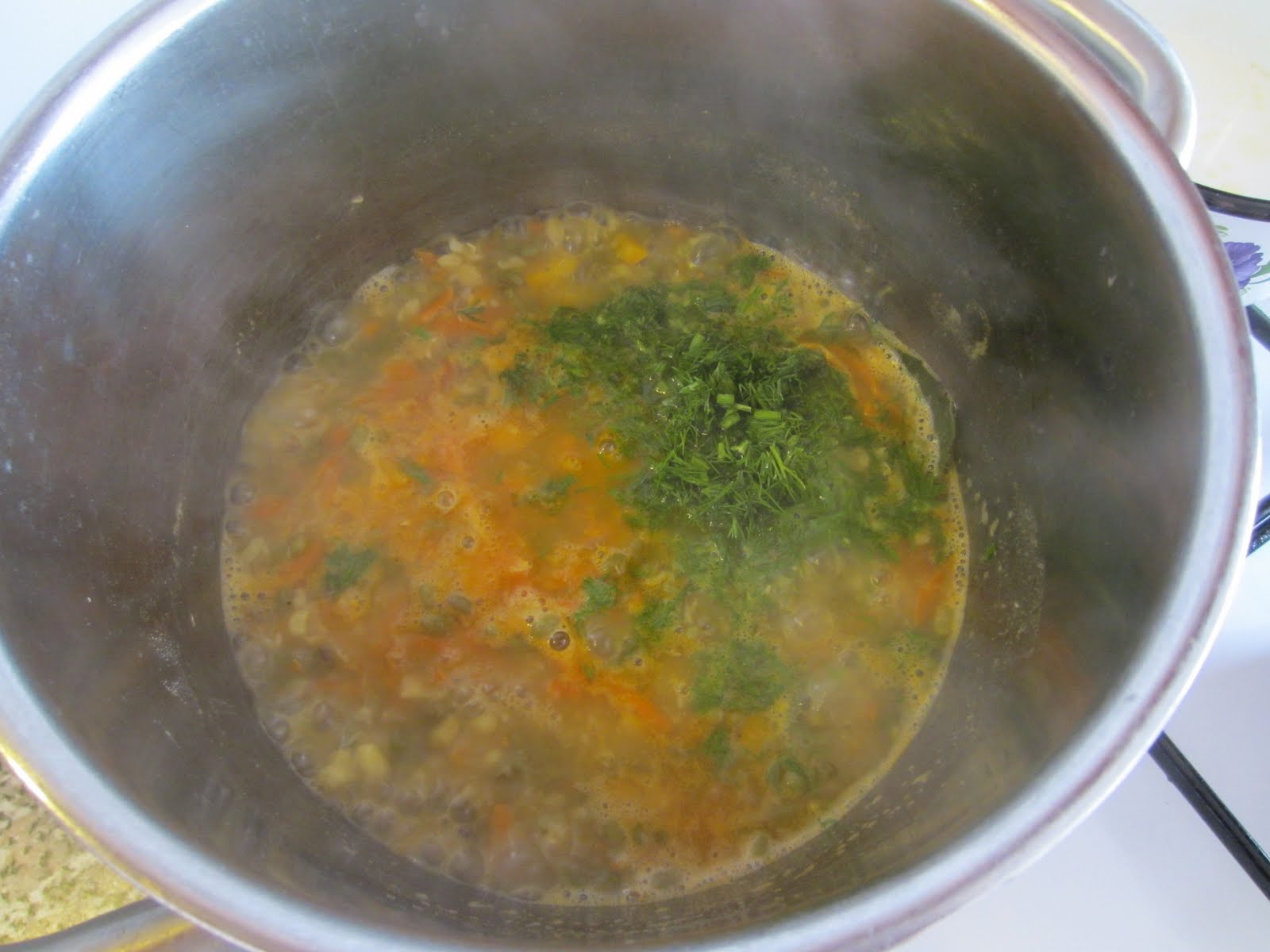 прикрываем крышкой и оставляем на огне еще на 5 минут. Выключаем, добавляем зелень,