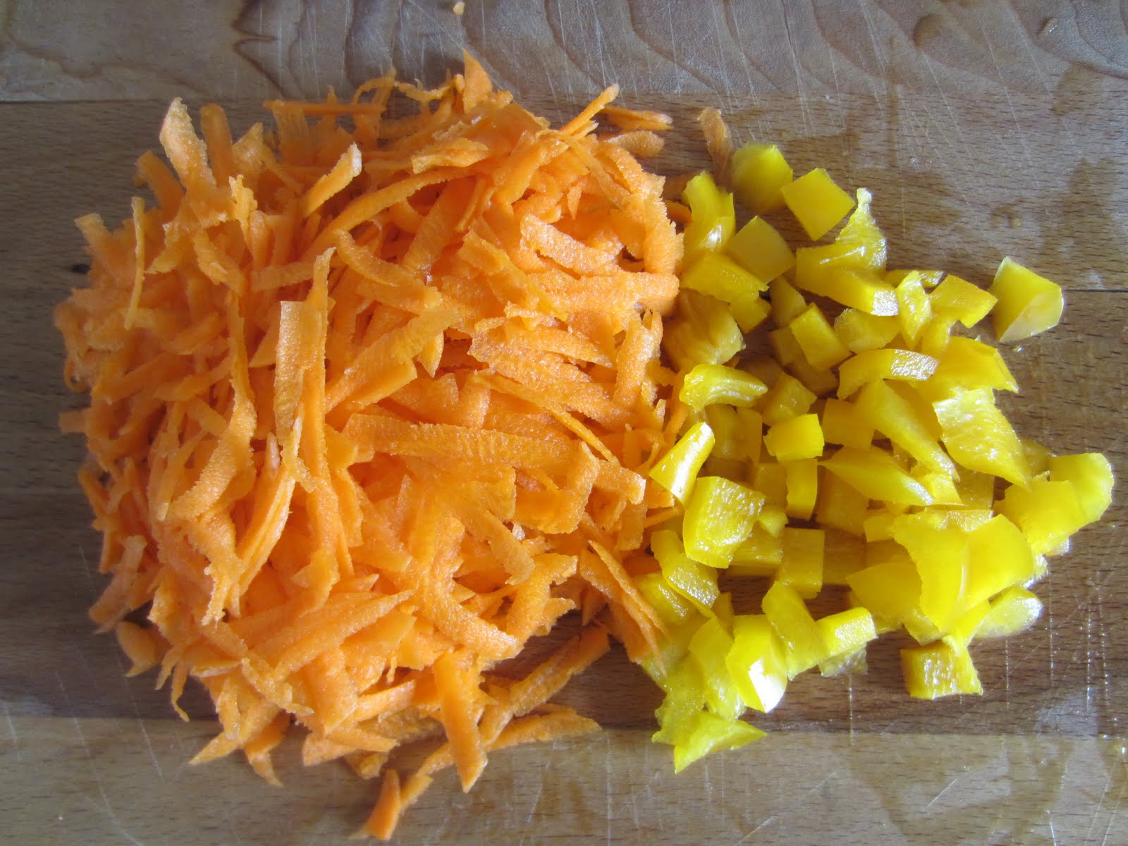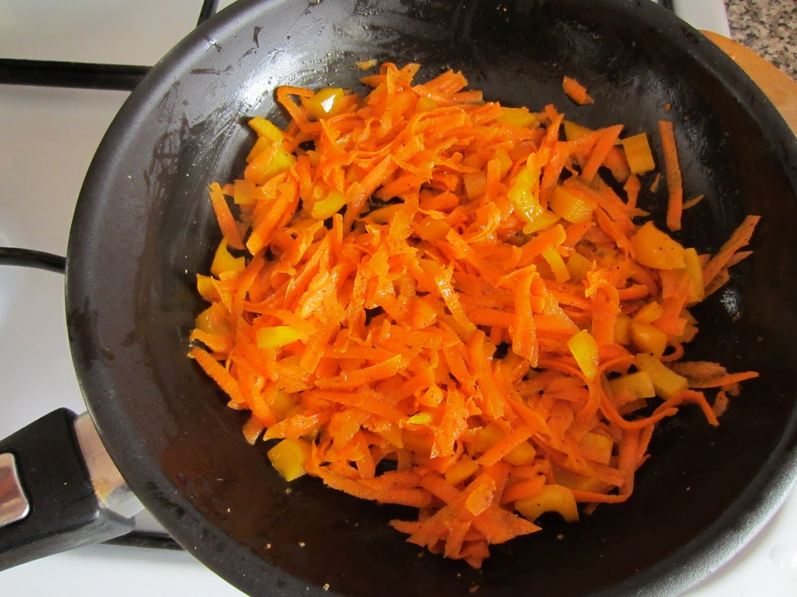 Добавляем морковь и перец, обжариваем на среднем огне около 15 минут, периодически помешивая.