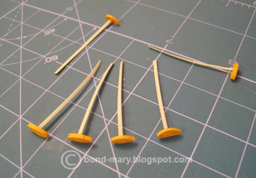 Тычинки. Миллиметровые полоски длиной 6-7 см скручиваем, чуть распускаем (на 1 миллиметр), придаем форму "глаз". Отдельно желтые полоски режутся по 1 мм в ширину и до 2-3 см длиной, клеим в середину каждого "глаза". С помощью клея закрепляем каждую тычинку в цветок (по 3-5 на 1 цветок).