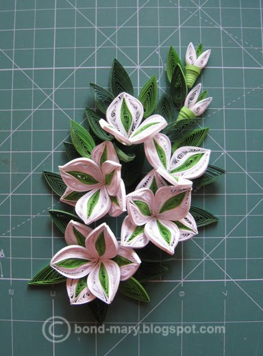 Листья (2 цвета) - из 2-3 склеенных полосок, экцентричные, форма "капля". В композиции их примерно 40-45 шт.