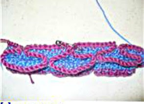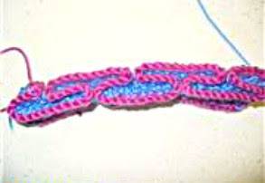 Для этого надо связать длинную полосу с учетом ,что при изготовлении рюши эта полоса станет ровно вдвое короче.