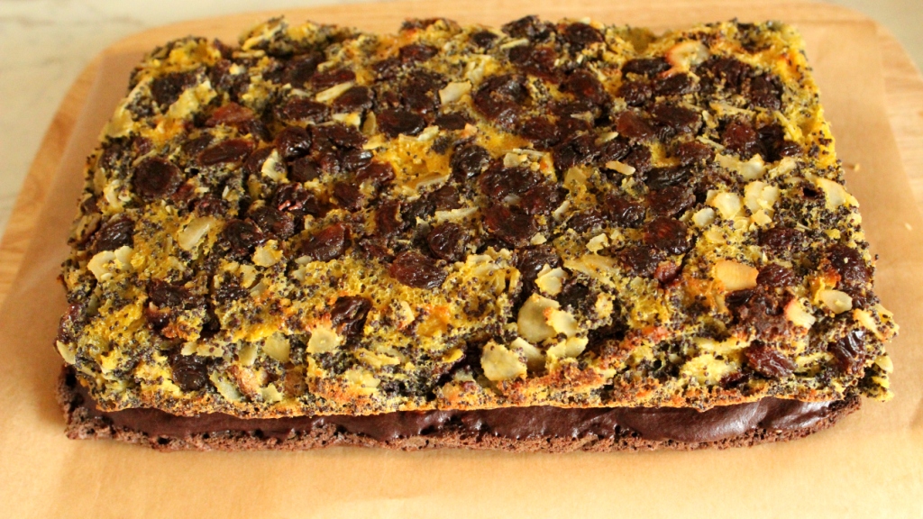Мак залить кипятком и оставить на 1 час. Затем воду слить, залить молоком и довести до кипения. Белки взбить до жестких пиков. Растереть сливочное масло с сахаром, постепенно добавить по одному желтки. Ввести охлажденный мак, молотый миндаль, изюм и ром . И, все аккуратно смешать с белками. Маковое тесто вылить в форму, и запекать около 40 минут при 180 градусов. Готовый корж охладить.
