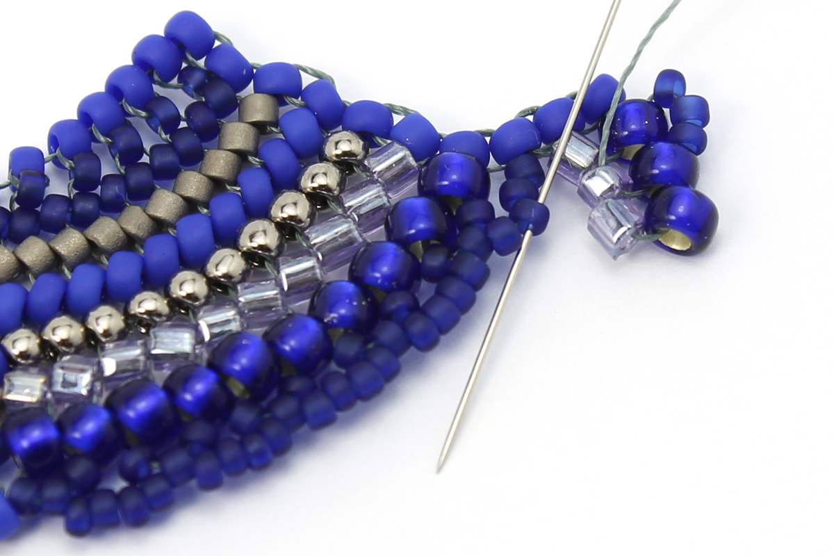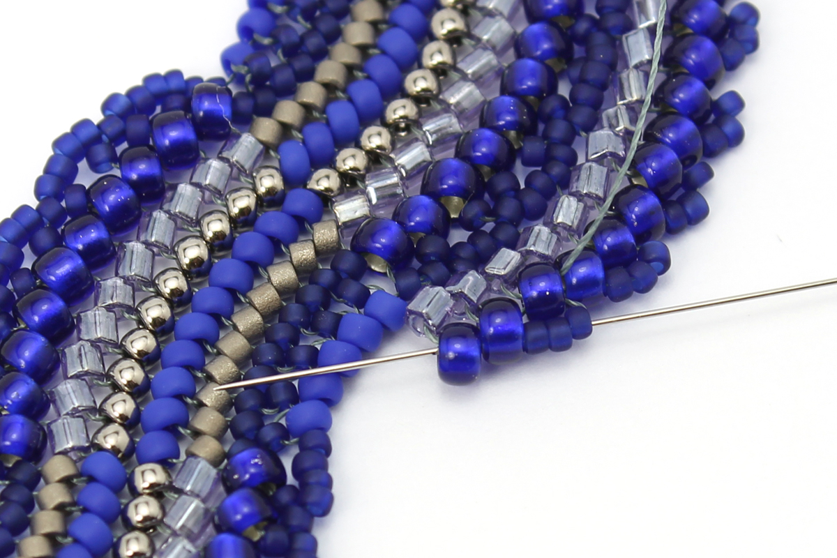 Плетем еще один ряд - завершающий, с бисером 11/0 #48F. Проплетаем этот ряд в обратном направлении, чтобы закрепить бисерины.