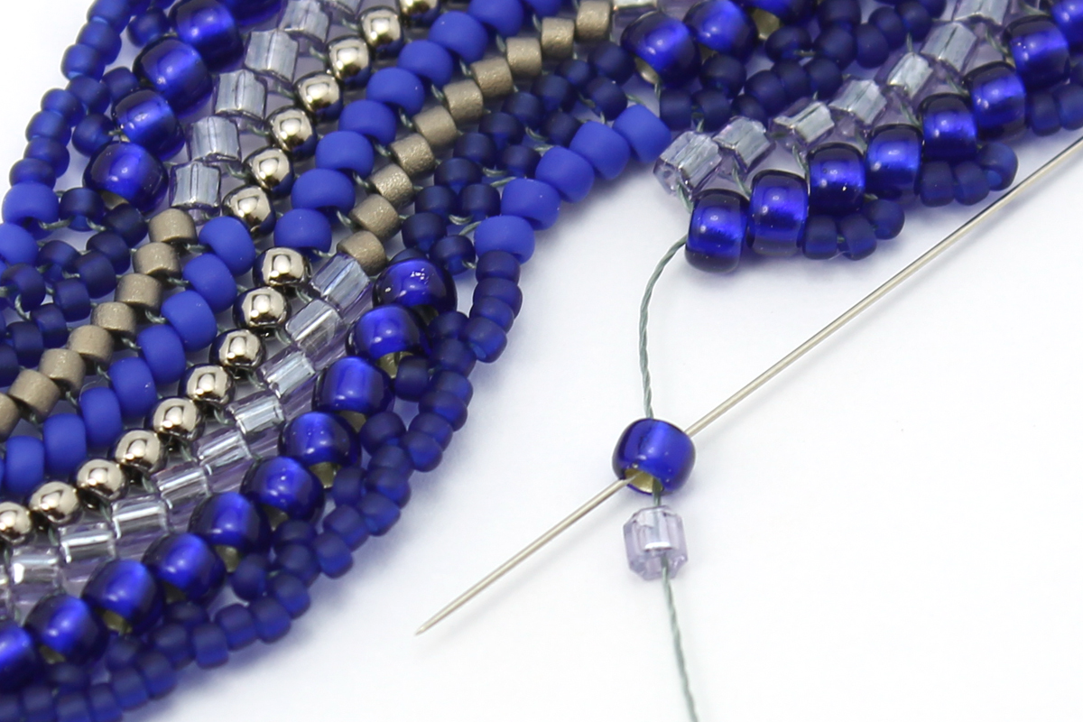 Затягиваем, набираем 8/0 и Hex, проходим через бисерину Hex предыдущего ряда.
