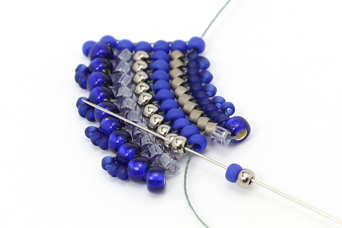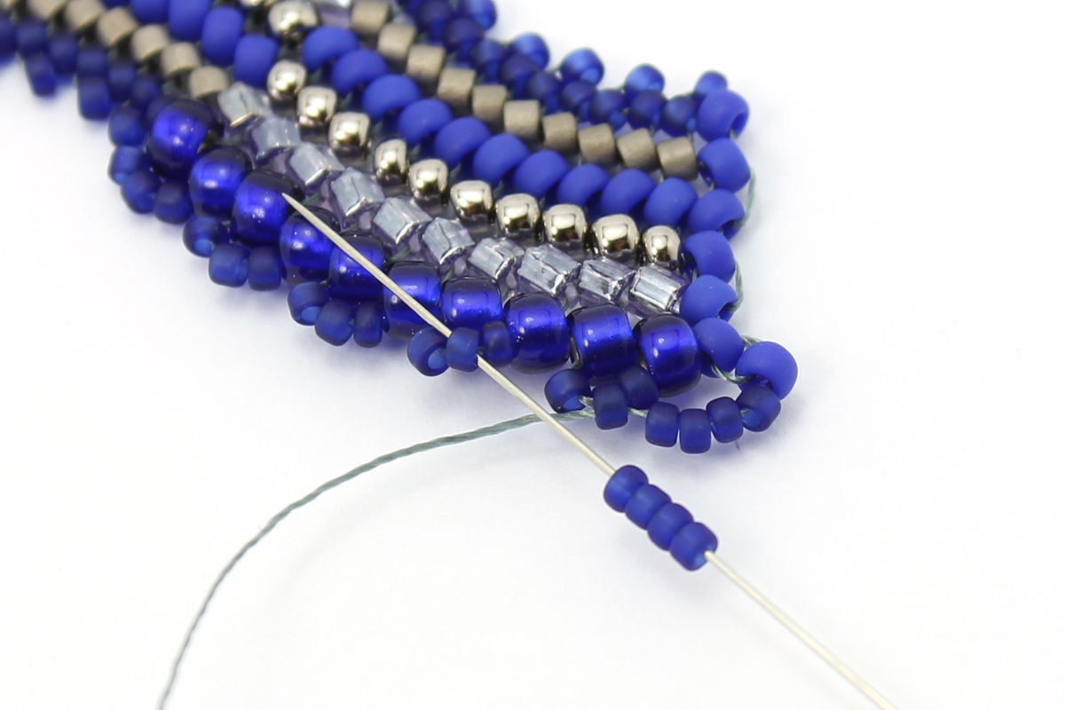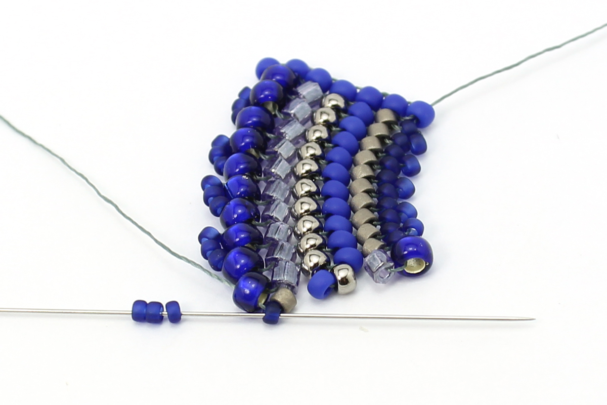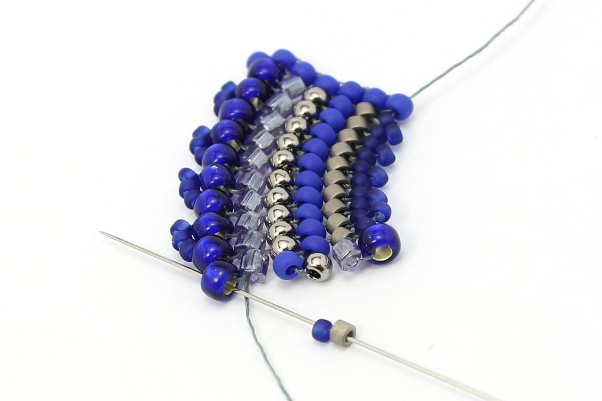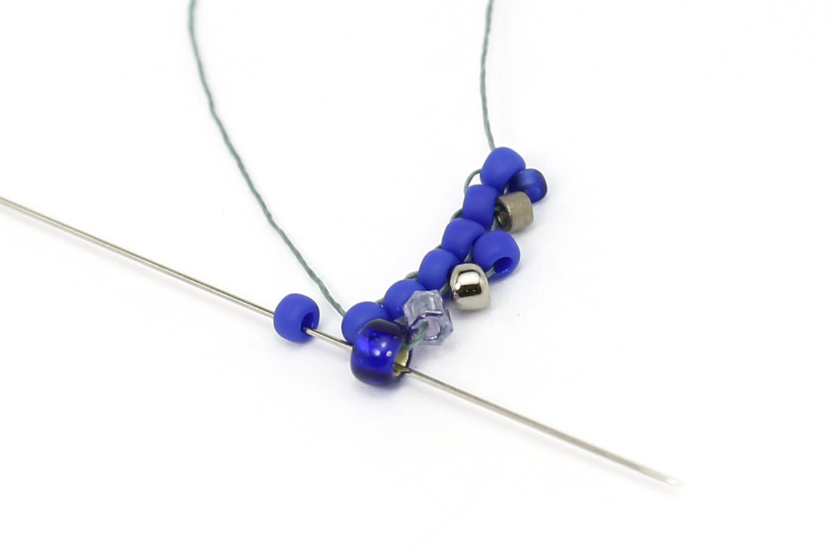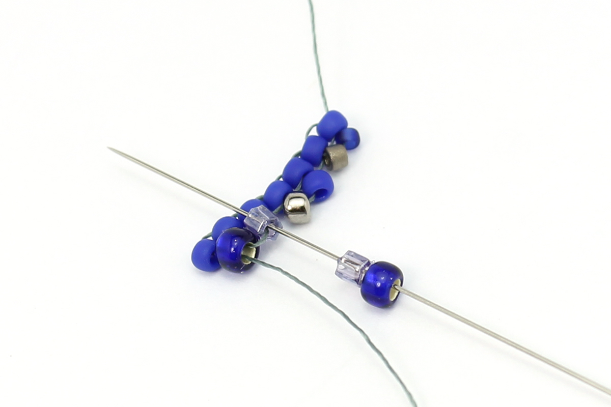 Теперь нам нужно, чтобы нить выходила из соседней бисерины, для этого проходим иглой через 3 бисерины 8/0, 3 бисерины 15/0 и через 2 бисерины 8/0 уже в обратном направлении.