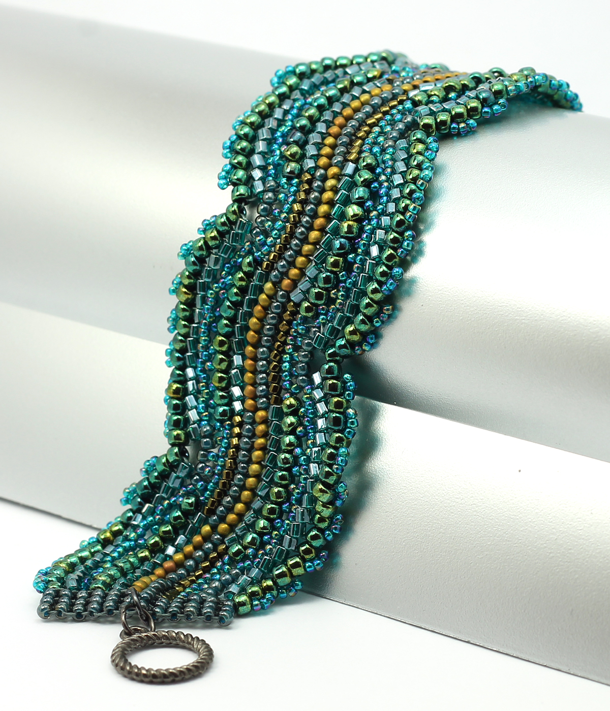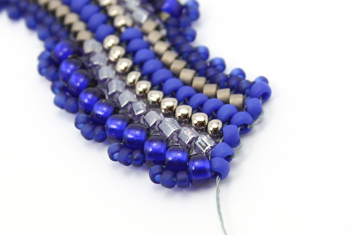 Проплетаем последние ряды в обратном направлении, чтобы закрепить бисерины. Прячем нити, прикрепляем замок.
