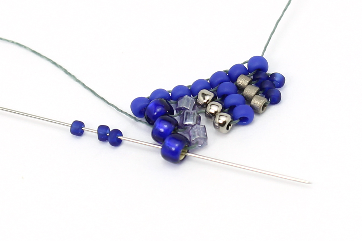 Набираем 2 бисерины - 15/0 и Delica 11/0, проходим иглой через 2-ю и 3-ю бисерины первого ряда: