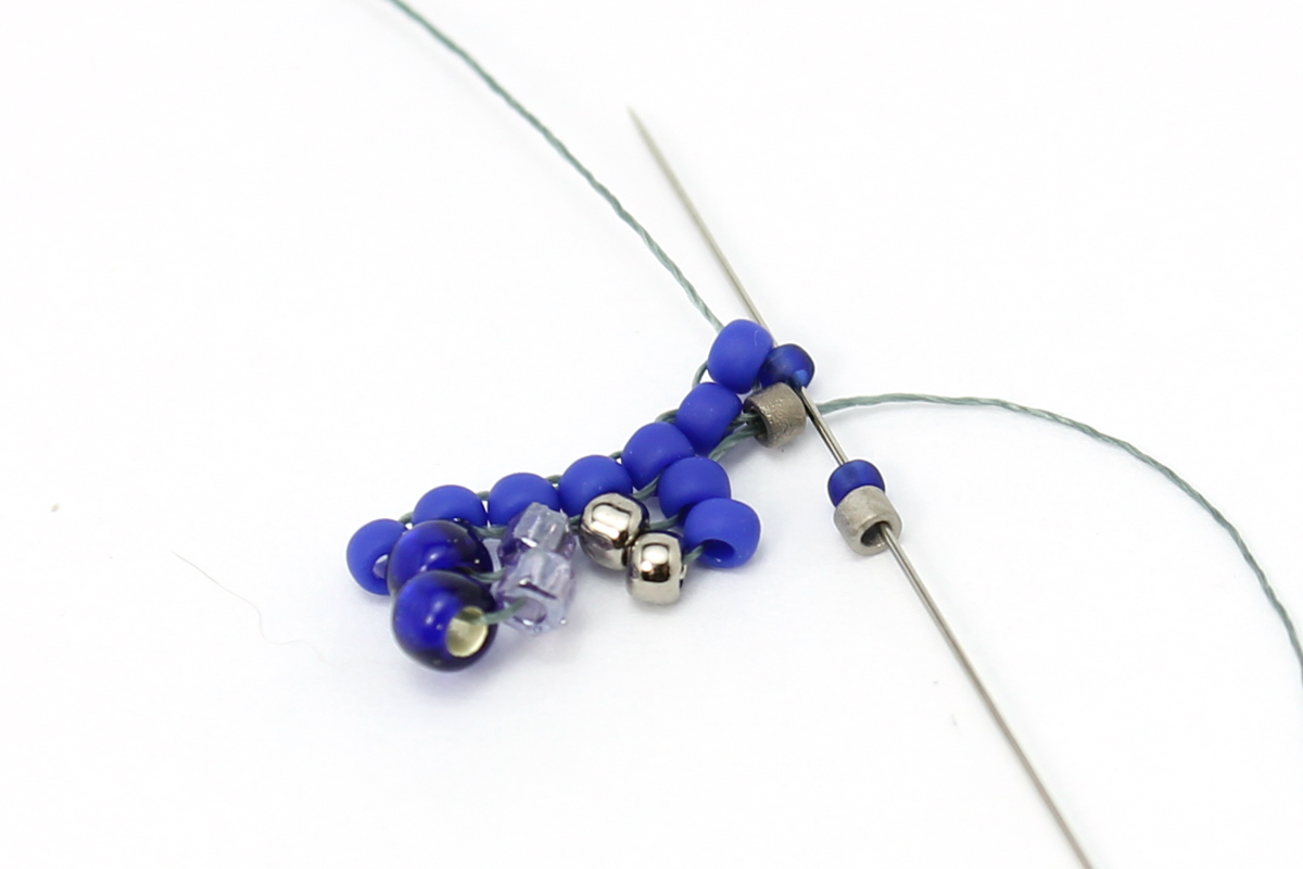 Набираем 1 бисерину 15/0 и проходим иглой через крайнюю бисерину 15/0.