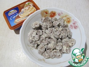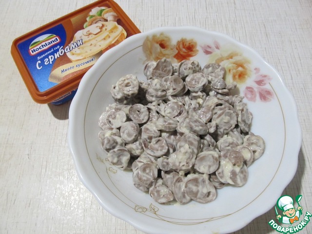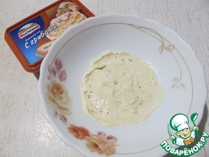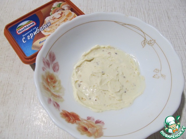 Для заправки пропустить чеснок через пресс, добавить плавленый сыр и майонез. Все хорошо вымешать.