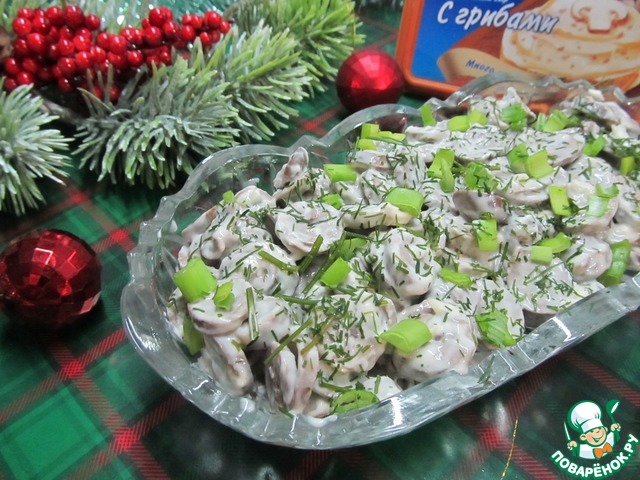 "Грибочки" выложить в салатник и украсить укропчиком и зеленым лучком. Салатик готов.