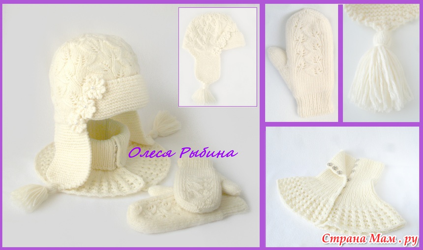 шапка-ушанка, манишка на кнопках, варежки двойные с пальцем-клином(реглан). На объем 59см.