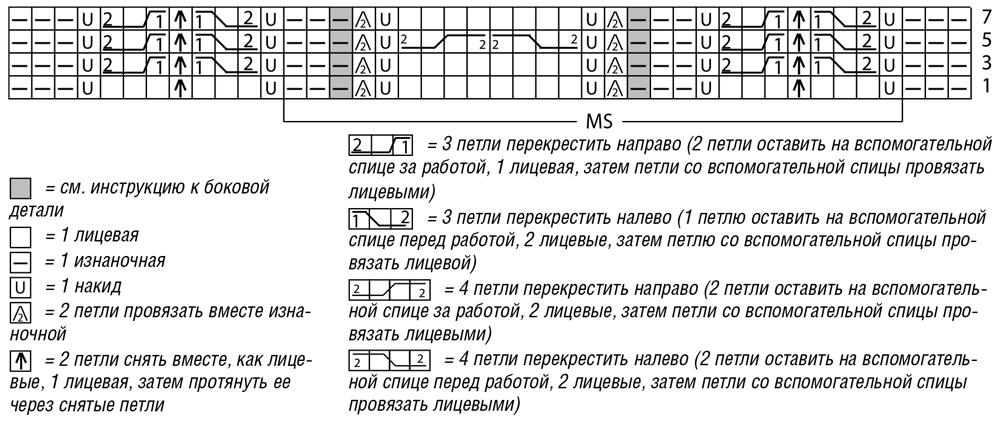 в конце ряда = вязать согл. узору до последних 6 п., затем 3 п. провязать вместе изнаночной, 2 изнаночные, кром.