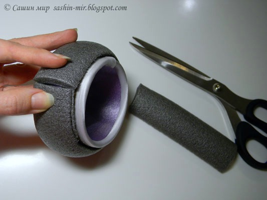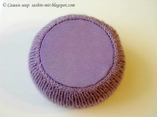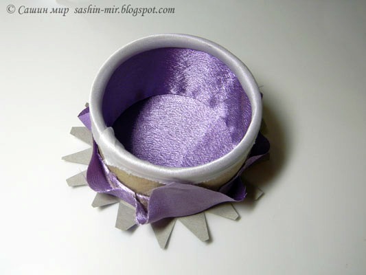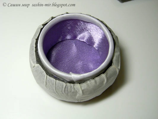 Снимаем кольцо поролона, куском ткани покрываем дно из картона, закрепляем края термопистолетом и надеваем кольцо. Теперь можно пойти отдохнуть на диване и повязать чулок. :))