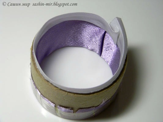 Для начала возьмем бобину от скотча или любую другую емкость подходящую для круглой шкатулки. Нужно обклеить полосками двустороннего скотча по краю внутри бобины и снаружи на противоположной стороне, фото из этого МК.