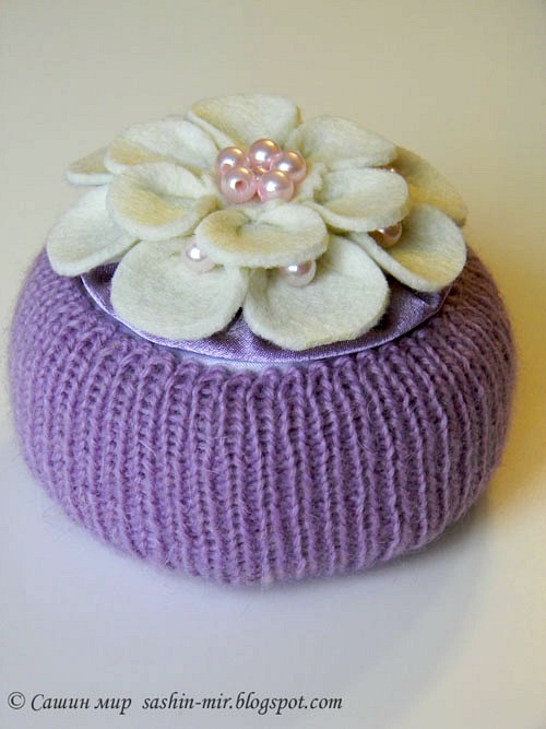 Связанный чулок примеряем на бобину, закрываем петли и крепим (термопистолетом) ко дну шкатулки, а затем и сверху. (Для чулка я набирала 100 петель и вязала резинкой 1х1.)