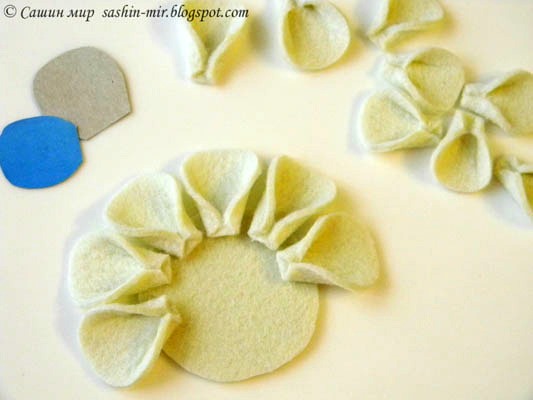 Из фетра вырезаем лепестки двух размеров. Края каждого лепестка склеиваем термопистолетом. Клеим в два ряда к основанию - кружок из фетра (размером меньше крышки примерно на 1,5см в диаметре).