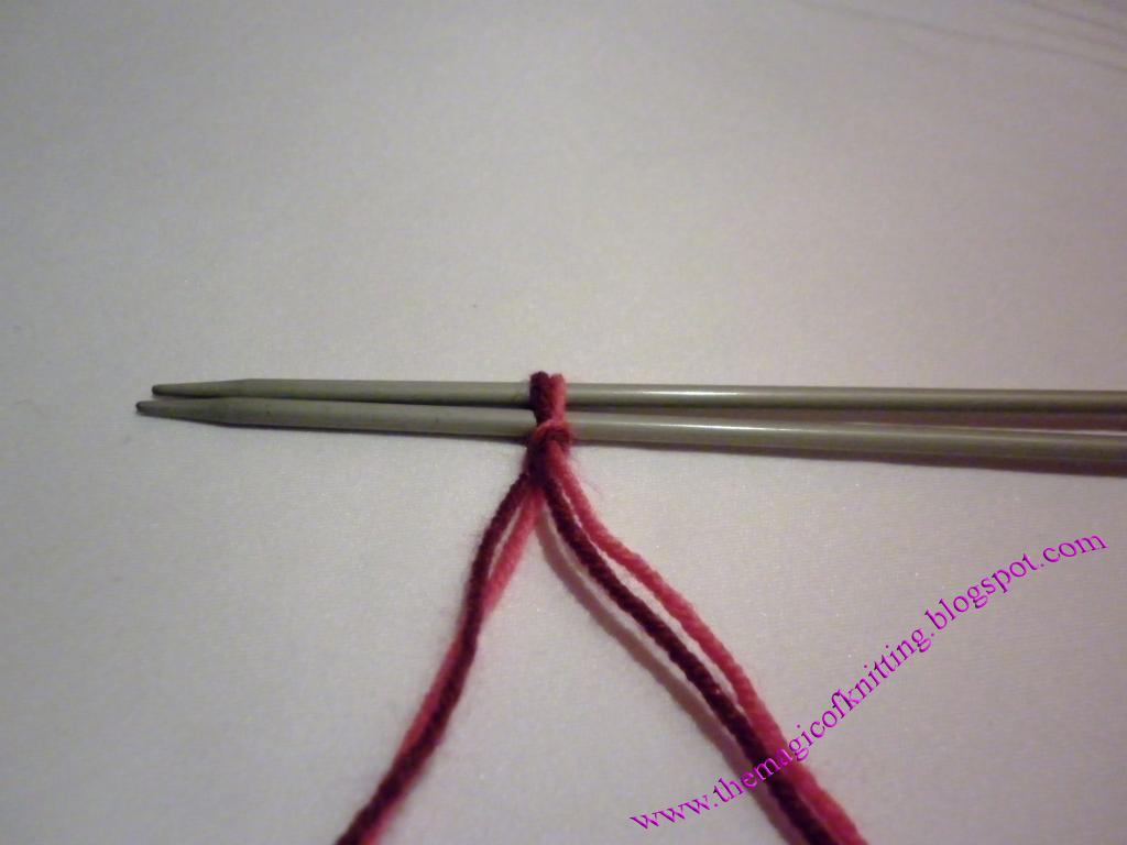 Итак, берем пряжу двух цветов, складываем их и набираем петли в 2 нити: