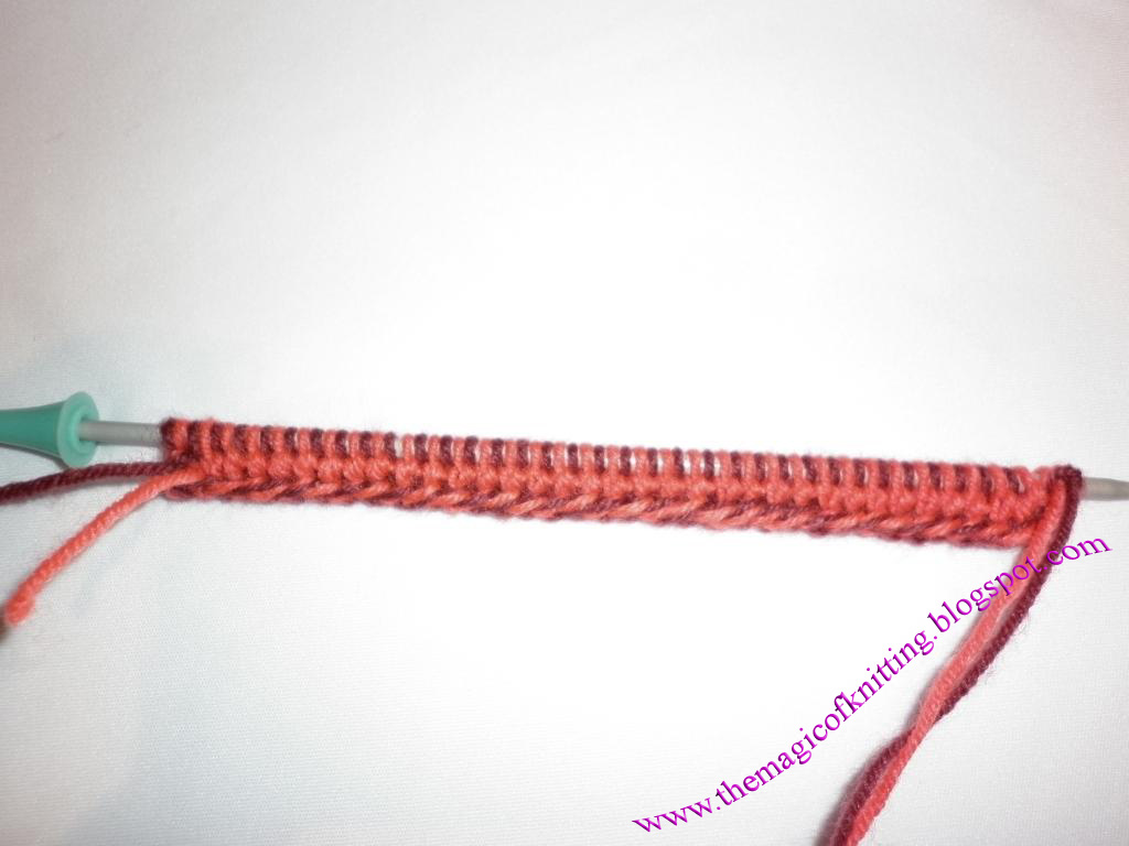 Теперь вяжем: первая и последняя петли ряда всегда провязываются в 2 нити лицевой (так получается красивый зубчатый край). Все петли лицевой (в данный момент) стороны вяжем лицевыми одним цветом, изнаночной стороны - изнаночными другим цветом: