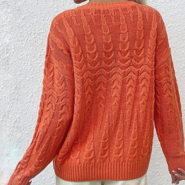 Это яркий оранжевый джемпер свободной посадки, выполненный очень интересным и небанальным узором, я бы назвала его градиентом из жгутов. В изделии смотрится красиво и оригинально. А ещё есть в нём что-то гипнотическое.