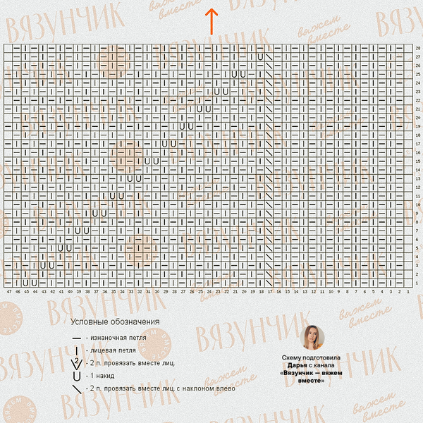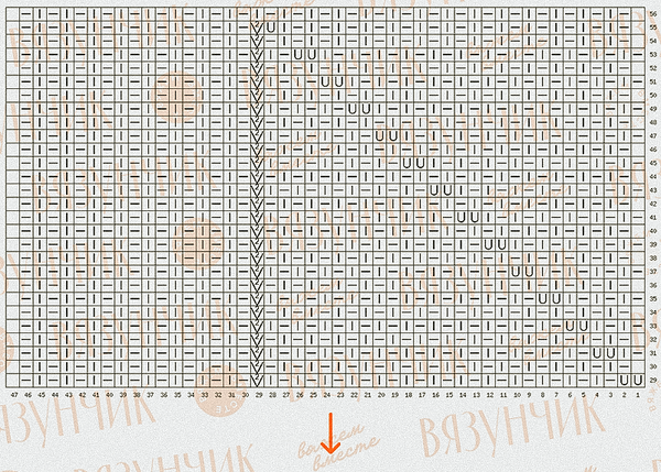 Раппорт узора по ширине равен 45 петлям. Но пусть лишние петли на схеме вас не пугают. Они появляются в процессе вязания, когда делаются двойные накиды. Пустые клетки — это "нет петли".