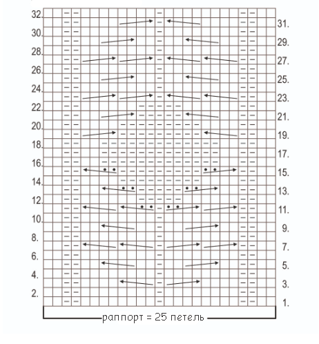 Раппорт основного узора = 25 петель и 32 ряда. На схеме обозначены все ряды, т.к. свитер вяжется круговыми рядами.