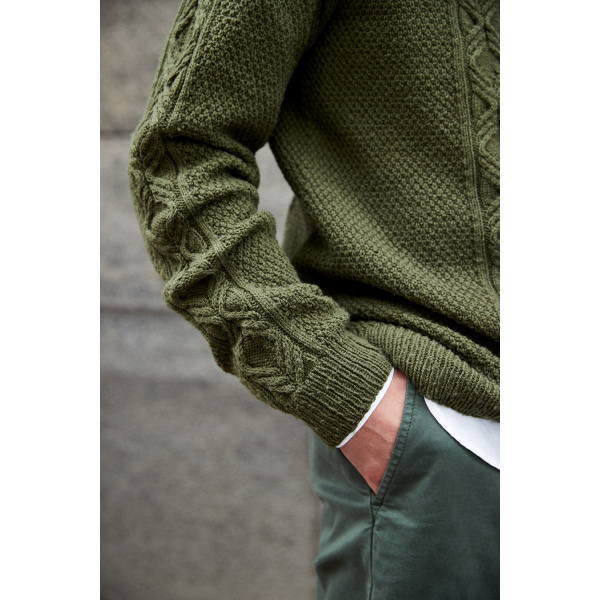 Эта модель цвета сосны (так указано на сайте её создателя novitaknits.com), связана без единого шва (если не считать небольшие швы на месте подрезов). Это показалось мне очень интересным. Да и вся модель для мужчин, выполненная весьма ненавязчивым узором, привлекла внимание не только моё, но и моих читателей.